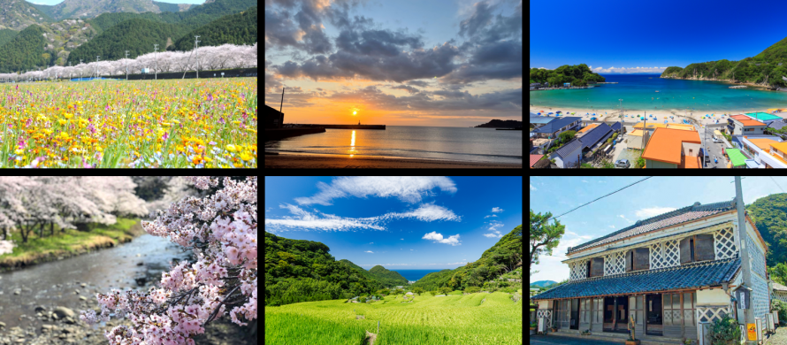 「花とロマンの里」松崎町は、伊豆半島西海岸南部に位置し、東に天城山系の山々を配し、西は駿河湾に臨み、那賀川、岩科川の流域には約500haの伊豆西海岸最大の平野を形成しています。海・山・川の豊かな自然と、風待ち港として多くの人、モノ、文化の交流によって栄えた歴史があります。棚田やなまこ壁の家並みが残っており、古き良き日本の原風景を身近に感じることができます。