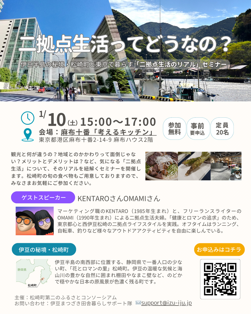 今回のセミナーでは、東京と伊豆半島の松崎町での2拠点生活を半年前からはじめられたKENTAROさんとOMAMIさんをゲストとしてお迎えし、「2拠点生活をはじめたきっかけ」「どんなペースで行き来しているの?」「地域とのかかわりって具体的には?」「2拠点のメリット」「デメリット」などリアルなお話しを伺います。