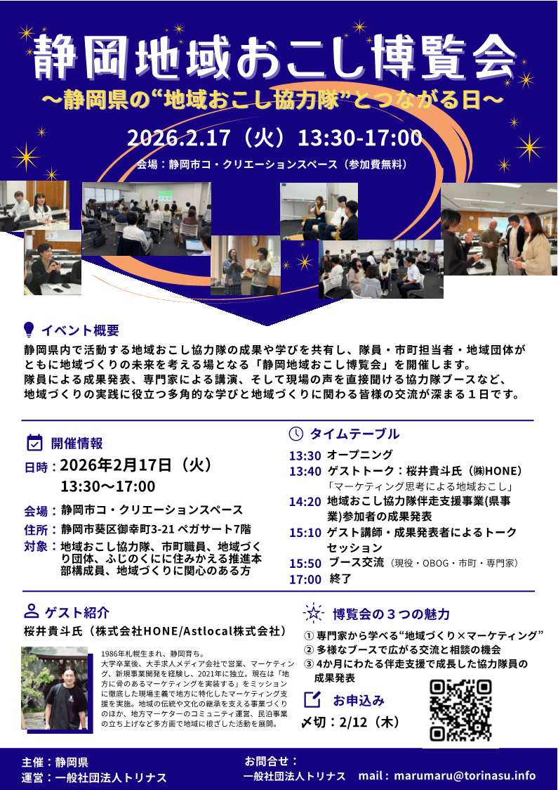 静岡県で活動する地域おこし協力隊が伴走支援事業(県事業)での成果を発表します。地域おこし協力隊の活動を紹介し、協力隊員・自治体職員・地域づくり団体など、地域づくりに携わる(関心のある)方が一堂に集まり、多角的な学びと皆様の交流が深まるイベントとなっております。
