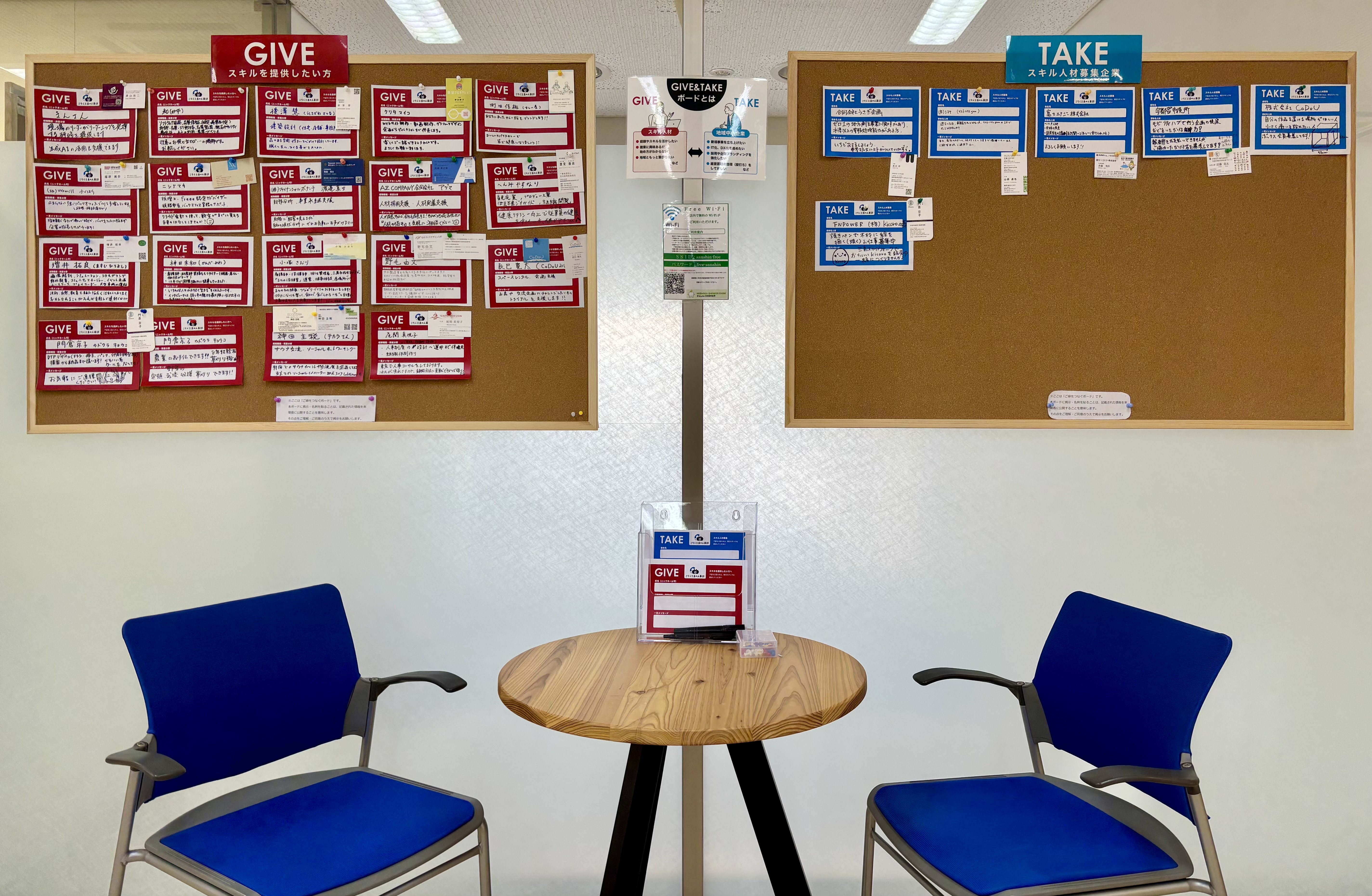 窓口には「ギブ&テイクボード」という仕組みがあります。「私はこんなスキルを提供できます」というギブの名刺と、「こんな人材を探しています」というテイクの名刺が掲示されており、見るだけでマッチングが成立することも。開設から2ヶ月で60人以上が訪れ、口コミで広がっていると言います。